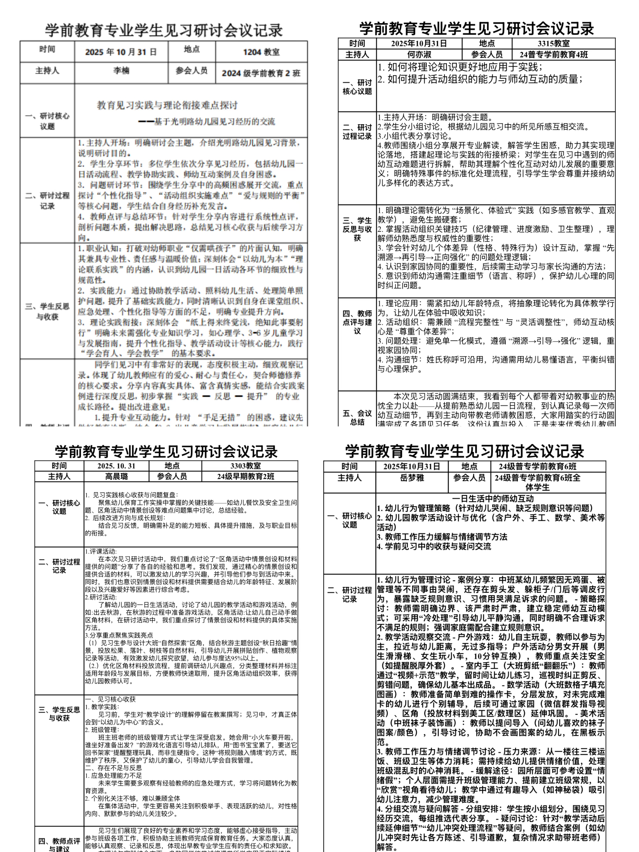 结束入园见习后,园所和学院分别组织见习反馈交流研讨会。通过汇报课评议、课标研习,深化对核心素养的理解,构建 “体验→矛盾→反思→重构” 的成长闭环。该机制不仅反向推动课程设计的持续优化,更助力见习生完成 “观察者→参与者→反思者” 的身份进化,为其后续教育研习、实习奠定了专业自觉,全面优化人才培养的实施路径与育人成效。